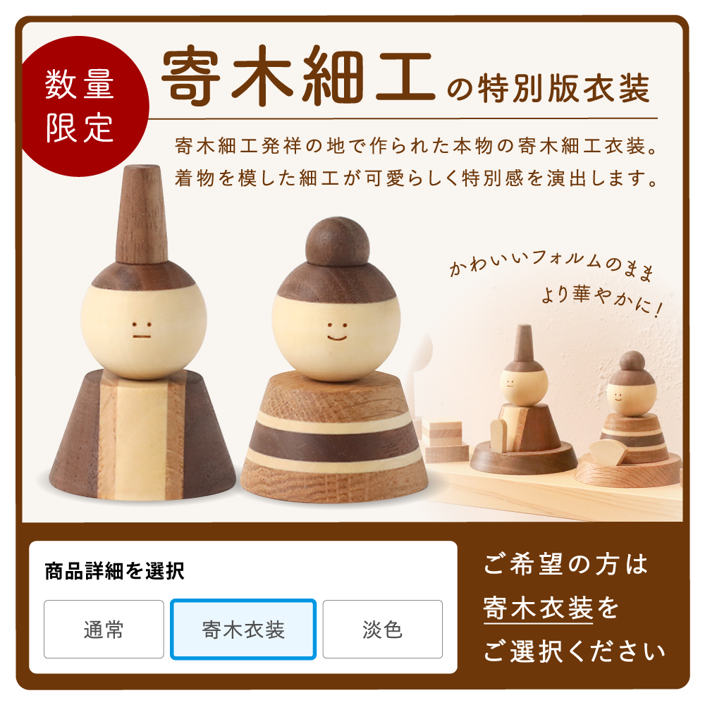 | 内容 | 台座、男雛、女雛(寄木衣装)、三人官女、桜橘、ぼんぼり×2、菱餅×2、御駕籠、お重、御所車 |