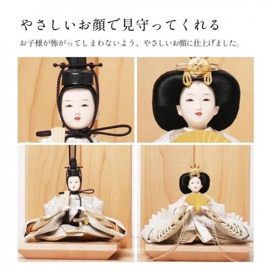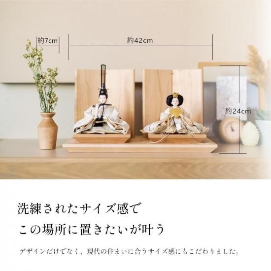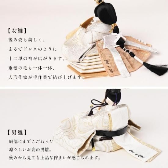 | サイズ | 設置サイズ:幅約45cm 奥行26cm 高さ約24cm ※一輪挿し含まず 女雛サイズ:横幅約20cm 高さ約12cm 奥行き約21cm(後ろ髪含む) 男雛サイズ:横幅約16cm 高さ約18.5cm 奥行約き17cm(着物部分含む) |