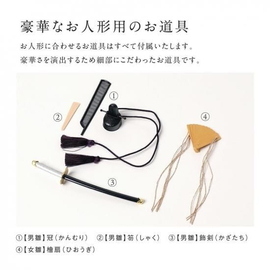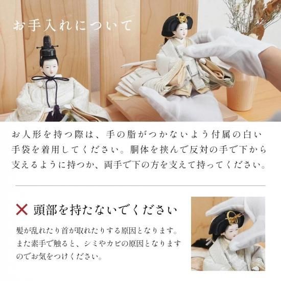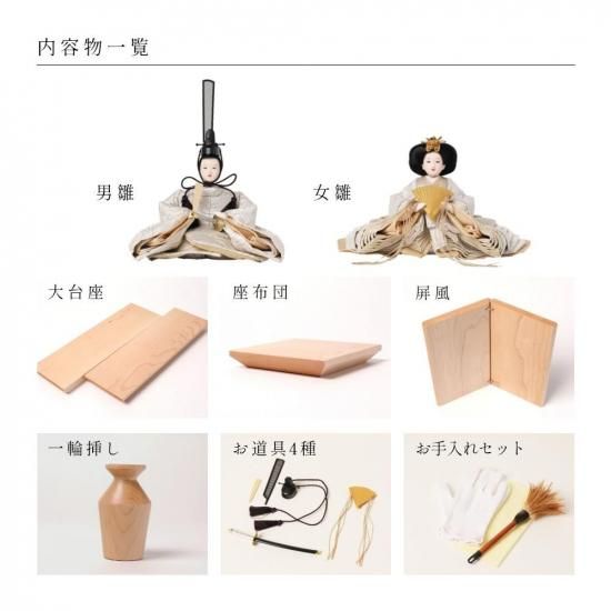 | 内 容 | 男雛(笏、冠、飾り太刀付き)x1、女雛(桧扇付き)x1、大台座x1組、座布団x2、屏風x2、一輪挿しx1、お手入れセット(毛ばたき、手袋、ウエス)、桐箱(人形用)x1、外箱(取手付) |