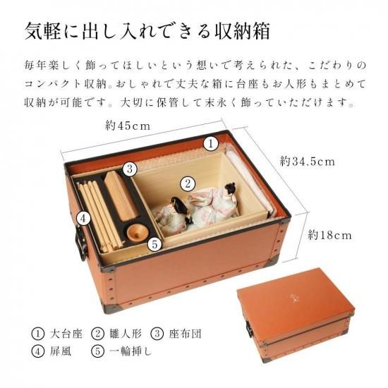 簡単に収納していただけるよう、人形専用の桐箱と木製の台座・屏風も一緒に収納できる取手付き外箱もご用意。コンパクトなサイズ感だから収納も困りません。
