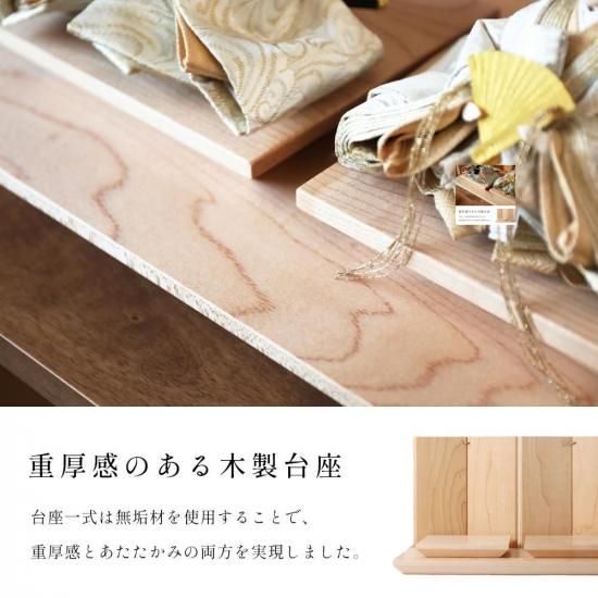 お部屋のインテリアに合わせていただきやすい木製となっており、雛人形の衣装着とも合わせて、メイプルで台、屏風をご用意しております。