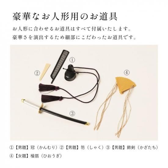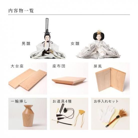| 内 容 | 男雛(笏、冠、飾り太刀付き)x1、女雛(桧扇付き)x1、大台座x1組、座布団x2、屏風x2、一輪挿しx1、お手入れセット(毛ばたき、手袋、ウエス)、桐箱(人形用)x1、外箱(取手付) |