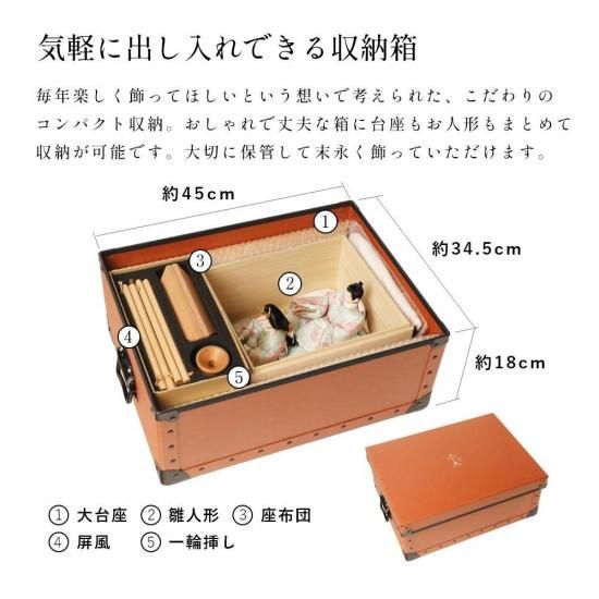簡単に収納していただけるよう、人形専用の桐箱と木製の台座・屏風も一緒に収納できる取手付き外箱もご用意。コンパクトなサイズ感だから収納も困りません。