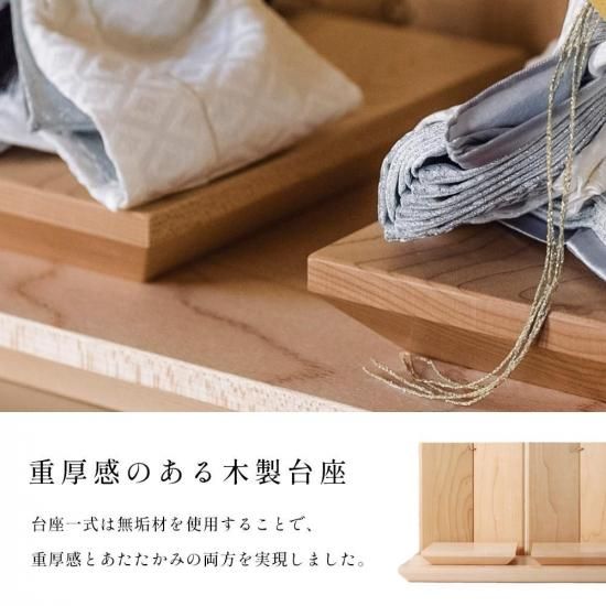 お部屋のインテリアに合わせていただきやすい木製となっており、雛人形の衣装着とも合わせて、メイプルで台、屏風をご用意しております。