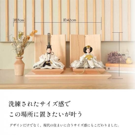 | サイズ | 設置サイズ:幅約45cm 奥行26cm 高さ約24cm ※一輪挿し含まず 女雛サイズ:横幅約20cm 高さ約12cm 奥行き約21cm(後ろ髪含む) 男雛サイズ:横幅約16cm 高さ約18.5cm 奥行約き17cm(着物部分含む) |