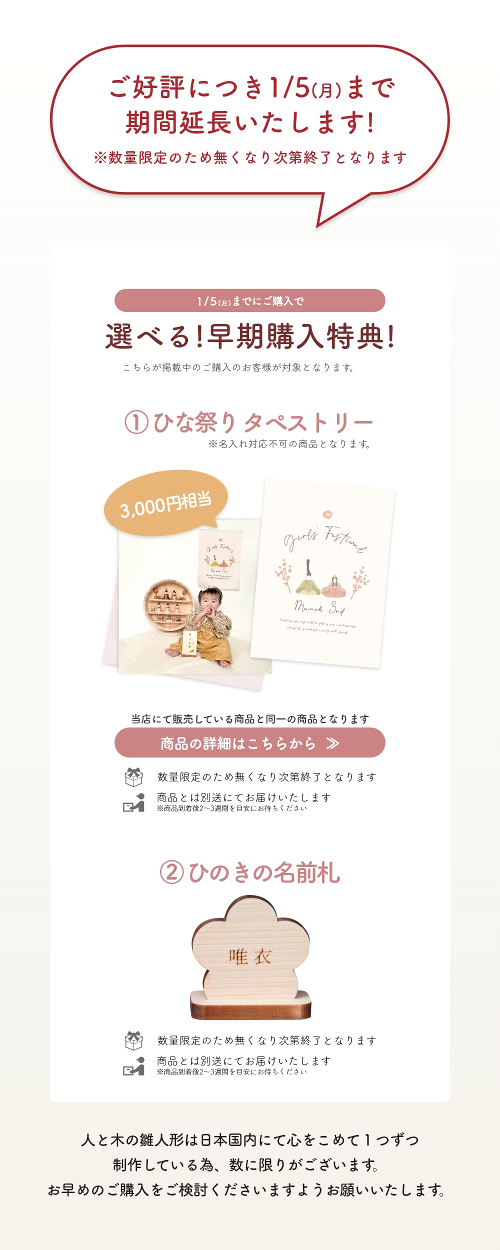 | サイズ | 設置サイズ:幅約45cm 奥行26cm 高さ約24cm ※一輪挿し含まず 女雛サイズ:横幅約20cm 高さ約12cm 奥行き約21cm(後ろ髪含む) 男雛サイズ:横幅約16cm 高さ約16cm 奥行約き17cm(着物部分含む) |