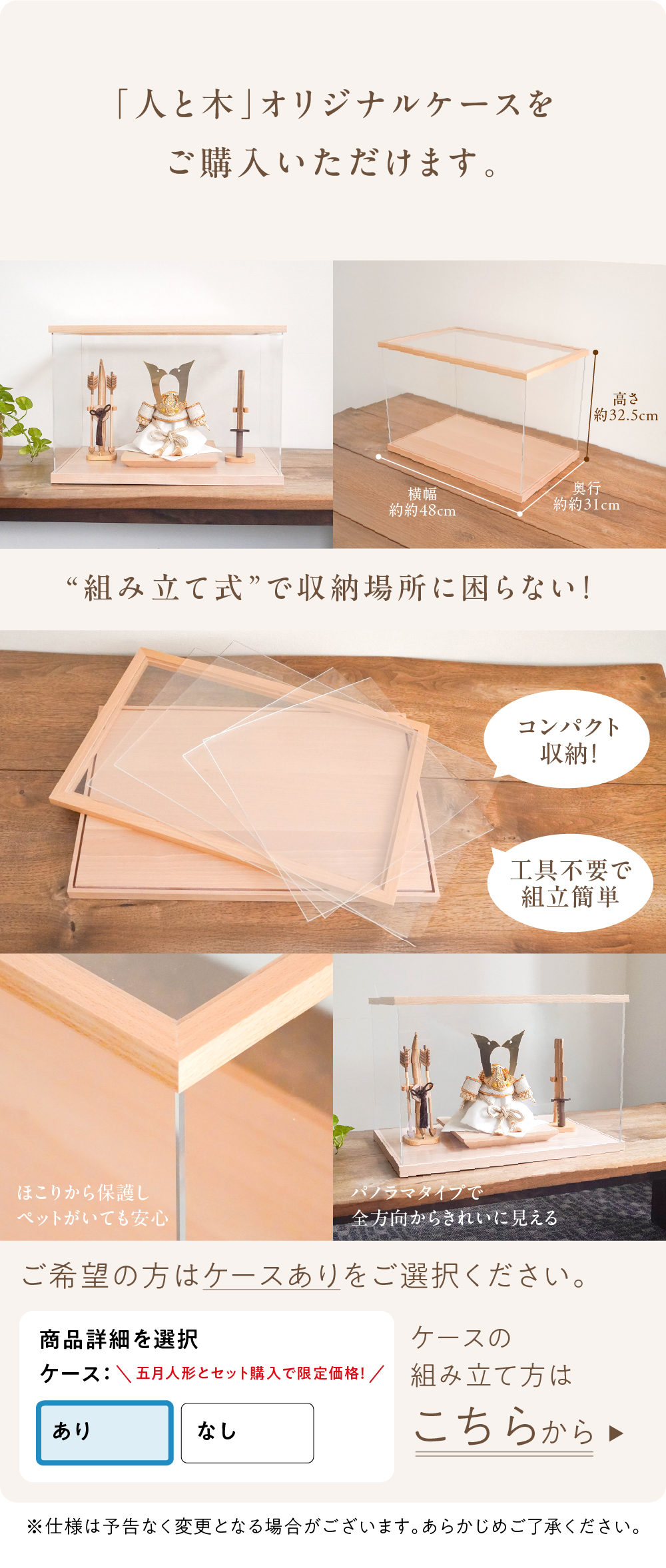 | 内 容 | 兜飾り:兜x1(前立て、忍緒)、芯木x1、ふくさx1、台座x1、お手入れセット(毛ばたき、ウエス、手袋) 破魔弓(破魔弓ありをご選択いただいた場合のみに付属):破魔弓x1、破魔矢x2、太刀x1、スタンドx1対 ※「破魔弓なし」をご選択いただいた場合、破魔弓は付属いたしません。 |