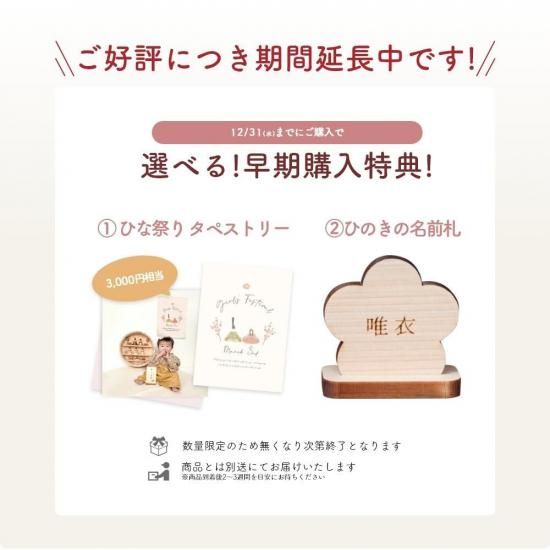 | 内 容 | 男雛・女雛・三人官女・一輪挿し(2個)・小台座(2個)大台座(2個) |