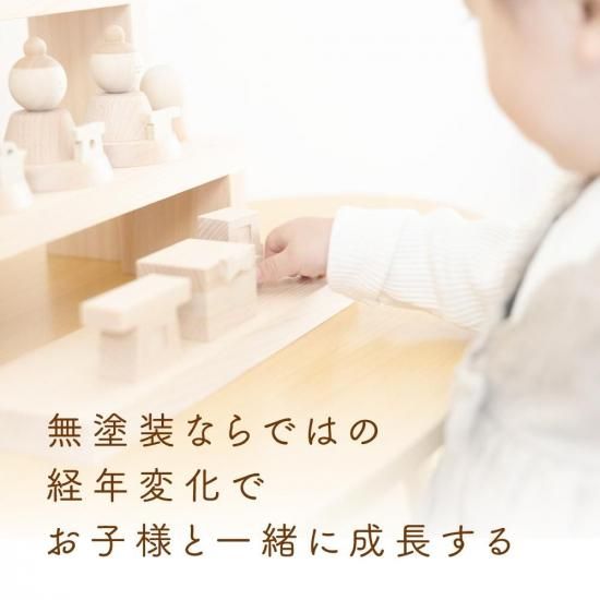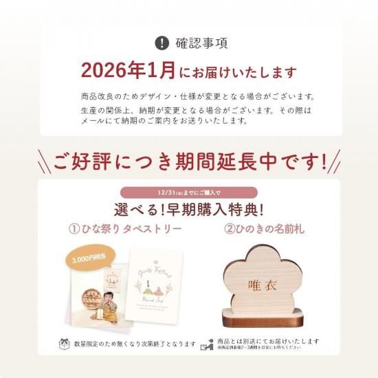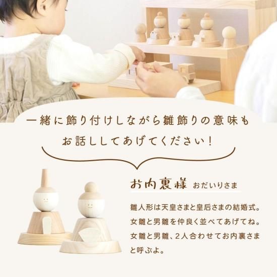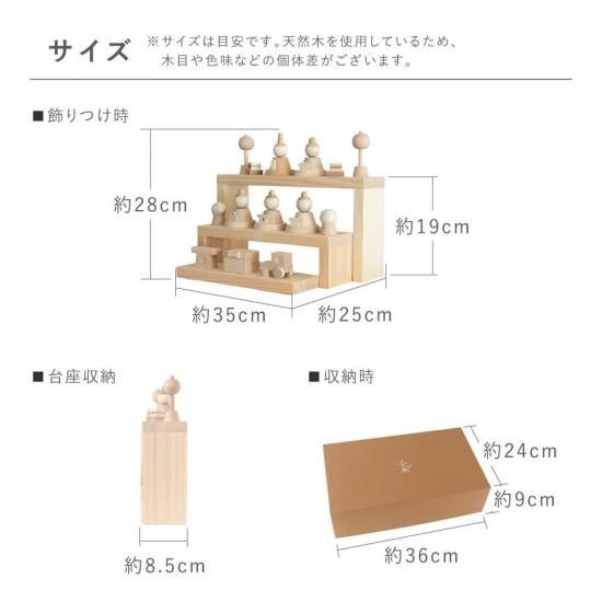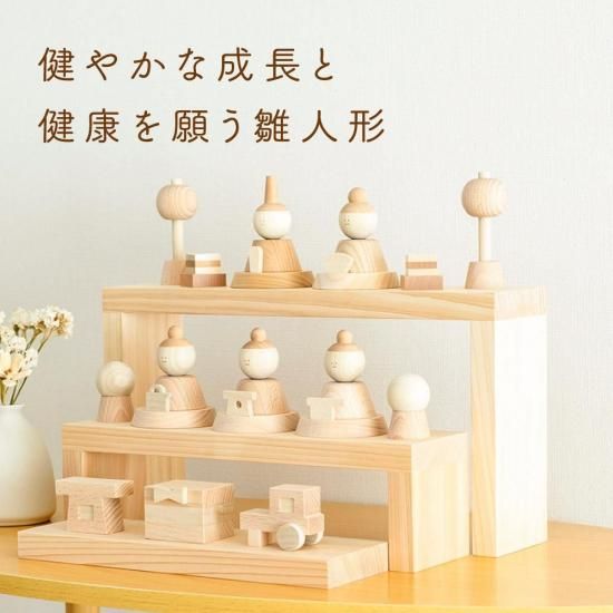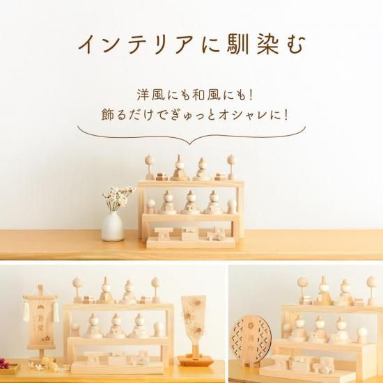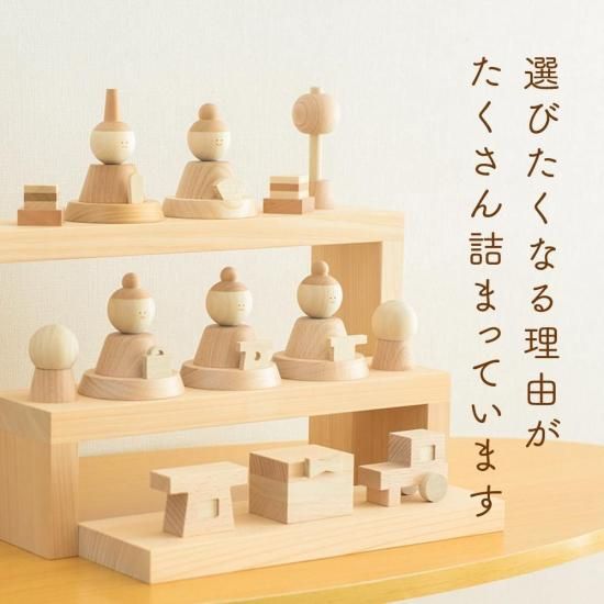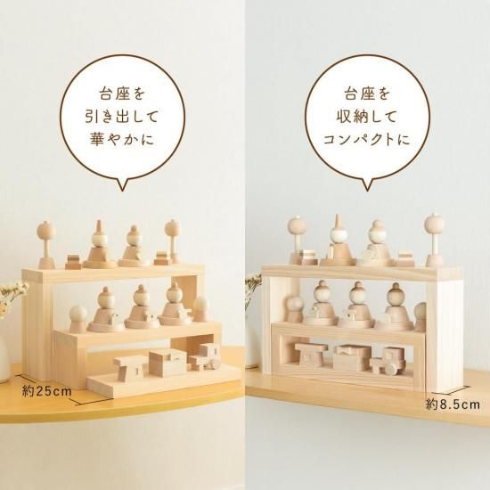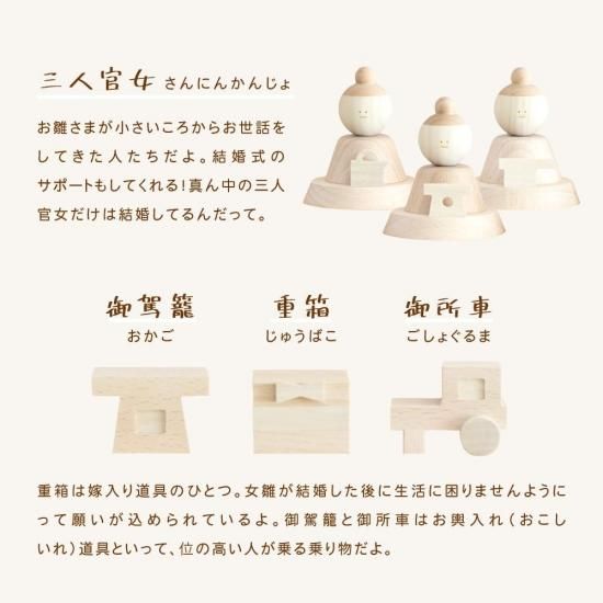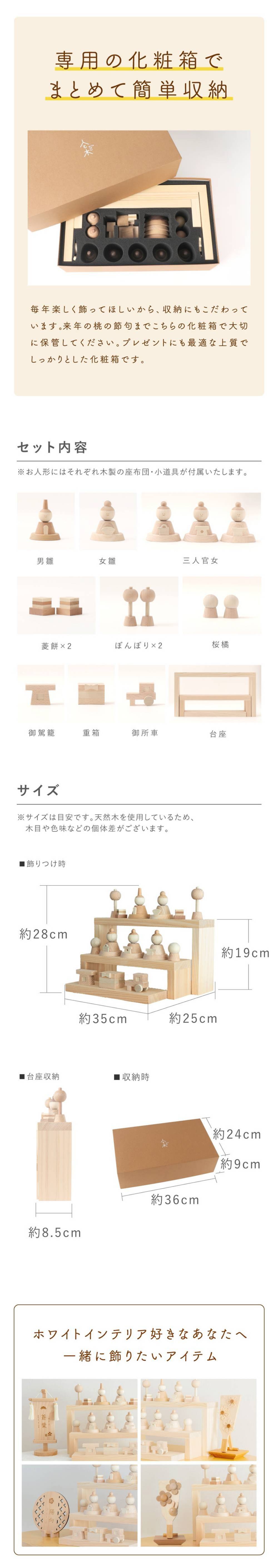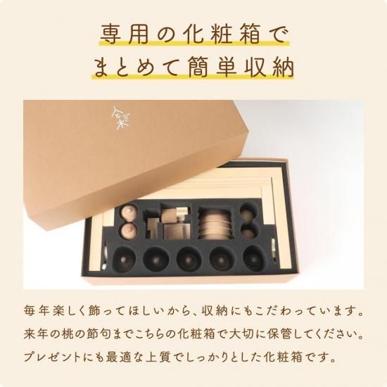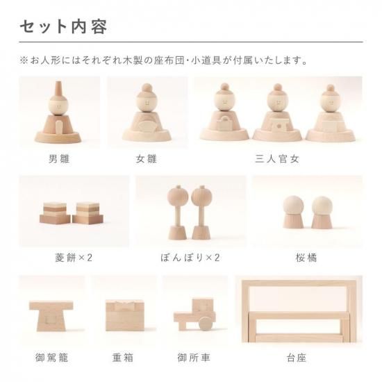 | 内容 | 台座、男雛、女雛、三人官女、桜橘、ぼんぼり×2、菱餅×2、御駕籠、お重、御所車 |